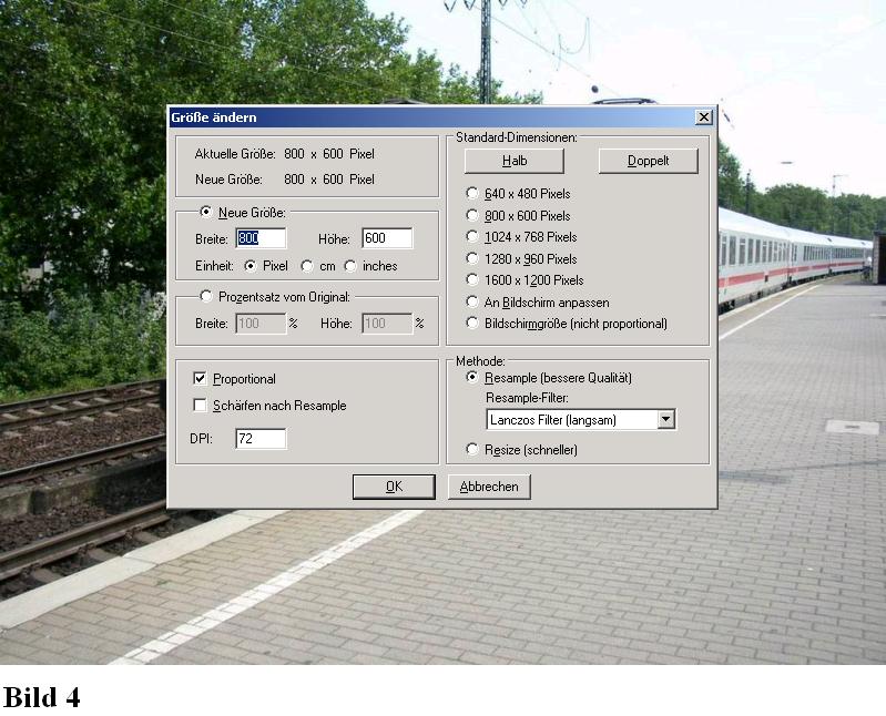 Ich möchte als Startbildschirm das Bild 1 angezeigt bekommen. diese habe ich mir aus einem Bilderarchiv heruntergeladen. Zuerst öffne ich das bild mit Irfan View, um mir die Bildgröße anzeigen zu lassen (Bild 2 und 3). Es sollte später ungefähr der Bildgröße des Train Simulators entsprechen. Bei mir ist die eingestellte Größe 800 mal 600 Bildpunkte und deshalb werde ich das bild mit Irfan View auf die Größe 800 (Breite) verändern. Da die Proportionen beibehalten werden sollen, wird die Höhe automatisch angepasst (Bild 4). Hier ist die Höhe bereits 600 Bildpunkte. Sollte das Bild eine geringere Höhe aufweisen, so wird noch ein Hintergrund benötigt. Um den Grund dafür verständlich zu machen, werde ich das Bild in der unteren Hälfte verkleinern.