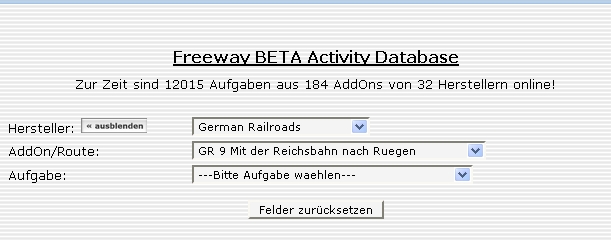 die Datenbank scheint ein technisches Problem zu haben, ich kann sie nicht erreichen.Diese FREEWAY-Datenbank ist eine Auflistung von Aufgaben mit einem entsprechenden Wiki-Bericht zur Aufgabe und kein Downloadbereich.