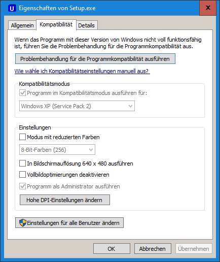 Bei den Einstellungen für Kompatibilität und Ausführen als Administrator sollte man nach meiner Erfahrung nichts auswählen.