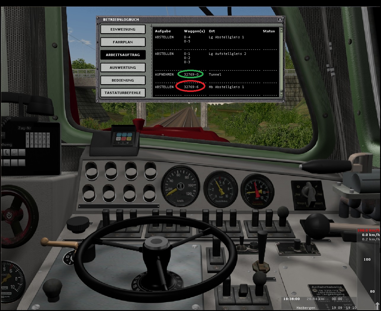 Wenn das Fensterchen "Wählen sie jetzt einen Wagen aus" mit OK bestätigt wird und sich geschlossen hat, geht man im großen Bild mit der Maus auf den Waggon, dort erscheint dann ein kleiner grauer Kreis und da drückt man drauf. Man wird dann noch aufgefordert, eine Ortsangabe zu machen (z.B. Tunnel), und fertig.
