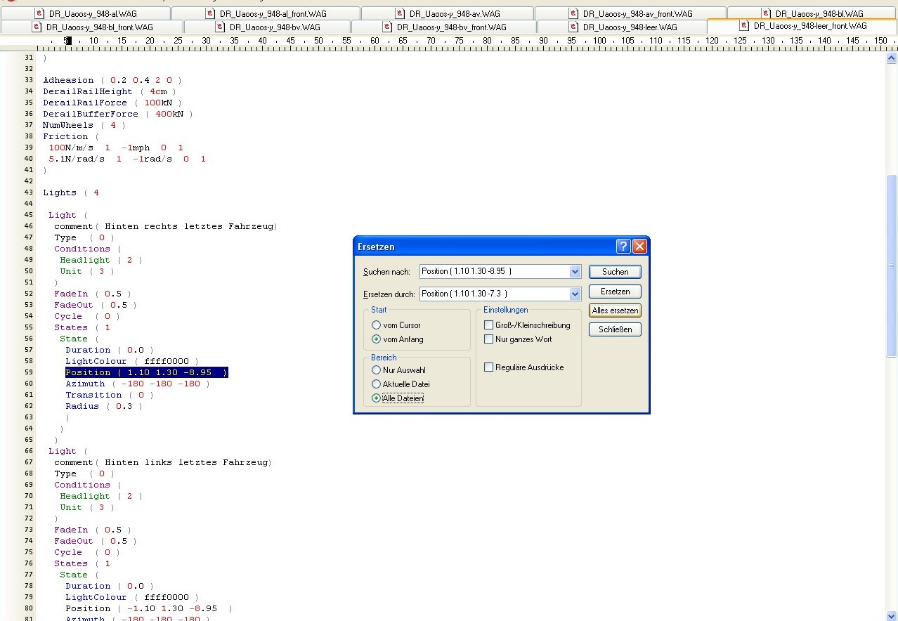 Wenn Du die Anregung von Freckel umsetzt, solltest Du direkt auch die anderen Kaliwagen ändern. Der Ordner GR-DR-G-Wagen4 enthält 5 .wag-Dateien ( DR_Uaoos-y_948-av/al/bv/bl/leer ), dies sind also 20 Änderungen ( 10 mit 1.10 und 10 mit -1.10 ). In der Datei DR_Uaoos-y_948-bv ist die Position des 1. Lichteintrages komplett falsch.